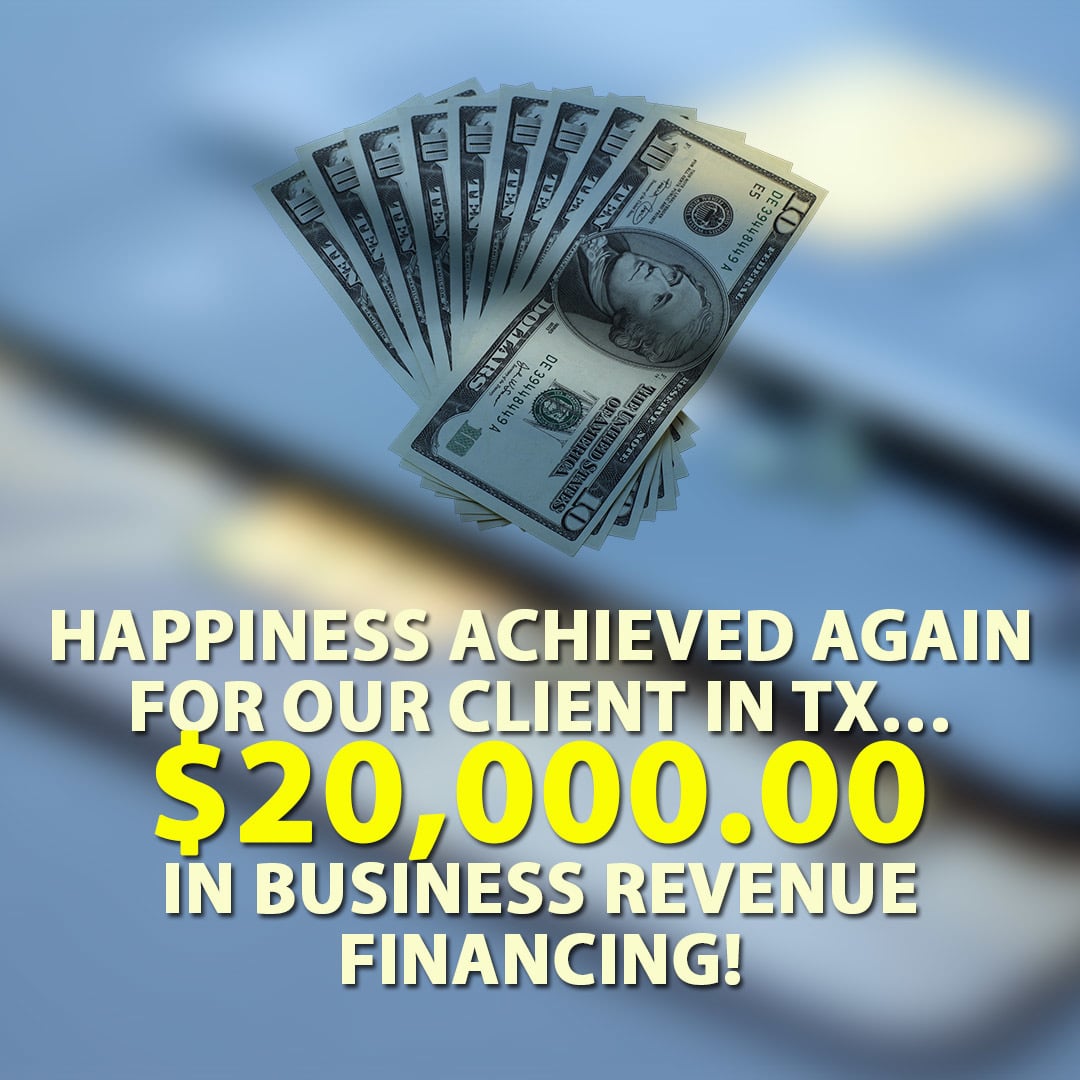 Happiness achieved again for our client in TX… $20,000.00 in Business Revenue Financing!